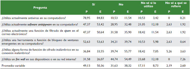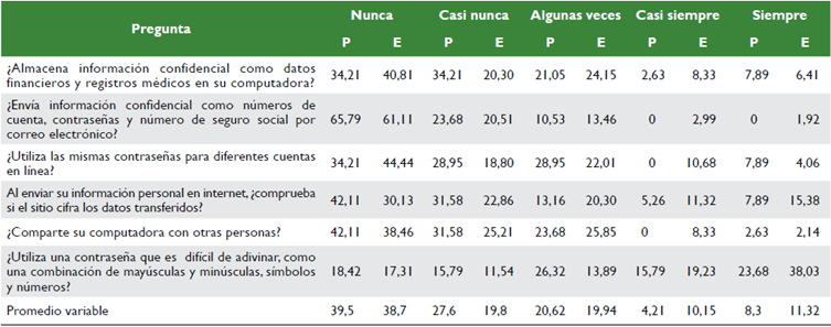 En la tabla 6, se encuentra un porcentaje aceptable del 39,5 % para profesionales (P) y del 38,7 % para estudiantes (E) sobre el comportamiento consciente de la seguridad informática; sin embargo, en la misma tabla, se pueden ver resultados que pueden considerarse como preocupantes, debido a que el 4,11 % de los profesionales y el 30,13 % de los estudiantes nunca revisan si un sitio cifra los datos que son transferidos a través de él. Situación que, al igual que en la tabla anterior, merece ser analizada usando como referencia el módulo de seguridad de la información que se imparte en la ESBOL.