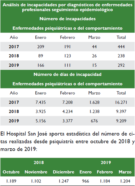 En relación con las enfermedades de los docentes de Bogotá, la Fundación Proservanda aporta las siguientes estadísticas que evidencian el impacto de las enfermedades psiquiátricas y comportamentales en el número de incapacidades (cuadro superior) y el número de días laborales perdidos por esta causa (cuadro inferior):