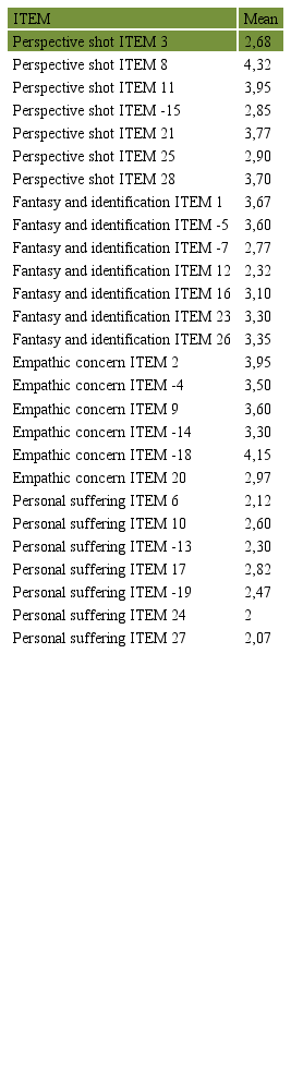 On the other hand, results of the empathy test indicate lower scores are given in items 6 ("in emergency situations, I feel aggressive and uncomfortable"), 24 ("I tend to lose control during emergencies") and 27 ( "When I see someone who urgently needs help in an emergency, I fall apart"), where item 6 registered an average of 2.12 that corresponds to the sub-scale of personal suffering, item 24 on the other hand had an average of 2 also of the sub-scale of personal suffering, meanwhile item 27 reached an average of 2.07, is part of the same scale mentioned previously. While the items with the highest scores were 8 ("I try to take into account each of the parties (opinions) in a disagreement (conflict) before making a decision") and the 18 ("when I see someone who is being treated unfairly, sometimes I do not feel any compassion for him "), since the item 8 registered an average of 4.32 in the sub-scale of taking perspective and for his part the item 18 had an average of 4.15, this is part of the sub-scale empathic concern (Table 2).