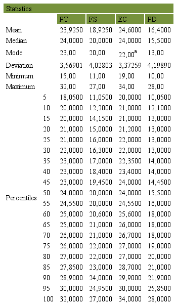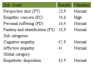 Results of the average corresponding to the four sub scales evaluated by the Davis Test show that the highest score is in the empathic concern dimension (24 / high), meanwhile the lowest score was registered in the dimension of personal suffering with 16.4. (Table 3),