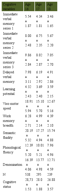 The 15-year-old group correctly marks more Ps and Ws letters in the cancellation test and remembers more digits series backwards than the groups of 17 and 18 and over. In the same way, the group of 15 years says in a minute more names of animals and more words that begin with the letter "s" than the groups of 16 and 18 years and older. The same pattern is repeated in the denomination task, where the 16-year group obtains higher scores than the groups of 17 years and 18 and over. Regarding the measure of cognitive status, performed through the Mini-Mental, there were also differences in means between the three statistically significant groups [ F(2, 1138) = 53.83, p <.001]. The older group scored lower compared to the other two groups.