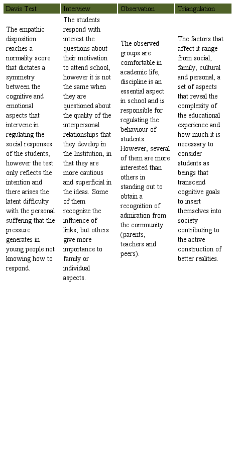 In the results of the Test applied around the levels of empathy, two subcategories are prioritized, in which cognitive empathy is called a normal reach and the same with the affective empathy, however, what was found in the interviews and the observations is that most have assumed behaviours of distrust or indifference. Faced with this incongruity that is reflected between attitude and action, the empathic disposition is affected, an effort that students fail to achieve because they are more concerned with themselves than with others. In the perspective of Murillo (2003) there are not only psychological or social factors, there are also the cultural factors that condition aspects such as the climate of coexistence, social class and family influence. Under this view the student is not an isolated presence but the sum of different influences that lead him to behave in a certain way and choose certain priorities. Likewise, according to the process of advanced observation, it is evident that the students are interested and concerned about their own or others' problems of coexistence, and to that extent, in the interviews, opinions were heard such as "I do not like to see other people mistreated Companion so be raising the voice "(E-012), in this way the sensitivity and empathy shown by the learners with higher performance also offers them the tools to respond to conflict situations.