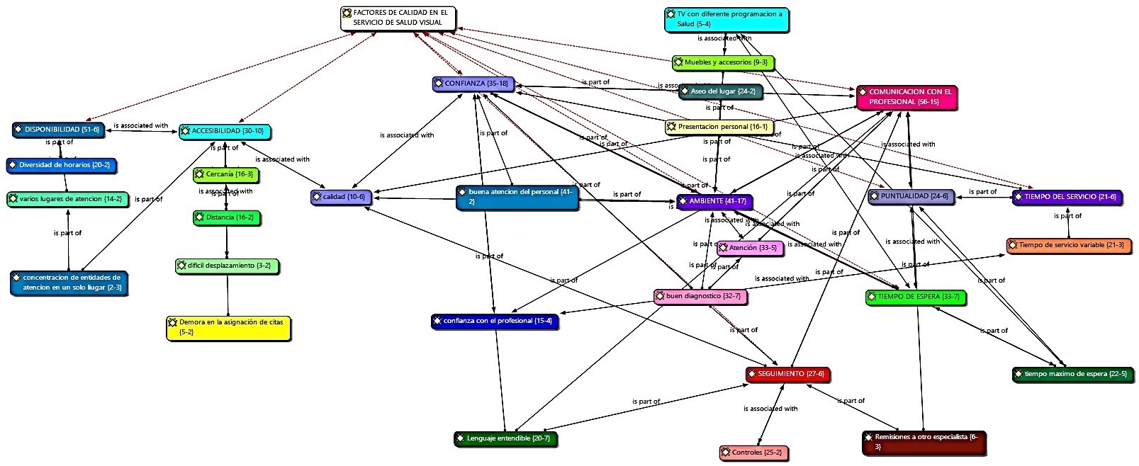 La comunicación con el profesional [56-15] se vinculó con la confianza [35-18] que según la literatura es la relación médico paciente, no obstante, en los entrevistados se encontró que la confianza, también es percibida en la relación con el profesional y con las personas a cargo de la óptica y los aspectos físicos en especial la higiene de esta misma y la presentación del personal, de igual manera se relaciona con el factor ambiente [41-17] en la literatura como aspectos físicos pero fue percibido como el servicio del personal de la óptica, por ejemplo: