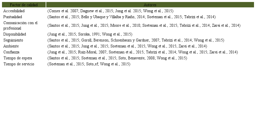 En este orden de ideas, al integrar la literatura de factores de calidad de servicio para el ámbito de la salud (Almeida et al., 2015; Jung, et al., 2015; Soeteman et al., 2015; Tabrizi et al., 2014; Wong et al., 2015); se encuentra que en común se deben evaluar la Puntualidad, Accesibilidad Comunicación con el Profesional, Disponibilidad, Seguimiento, Ambiente, Confianza, Tiempo de Espera y Tiempo de servicio. A continuación, se definen estos conceptos, así mismo abordados por diferentes autores ver la Tabla 1.