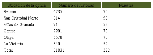 Es así, que posterior al análisis de resultados se realizó la etapa cuantitativa a través de un formulario de preguntas cerradas tipo Likert diseñada para los fines de esta investigación, dado que la literatura no reporta un instrumento adecuado para este ámbito. A su vez se contó con una Tablet y los cuestionarios impresos para evitar renuencia a respuesta. El instrumento se aplicó a 382 personas usuarias del servicio de optometría, a las cuales se les realizo un consentimiento informado al iniciar la encuesta donde aceptaban que sus respuestas serian para uso académico, en edades entre 18 y 60 años, en 6 ópticas de Bogotá, ubicadas estratégicamente ver Tabla 2, seleccionadas aleatoriamente, para así abarcar la mayor población de esta a nivel de diferentes barrios, a las cuales previamente vía telefónica se les indago el número de historias clínicas, que corresponde a el número de pacientes atendidos desde el momento en que la óptica fue fundada hasta el mes de octubre de 2015 para así poder distribuir la población equitativamente, según el dato que fue administrado por estas, teniendo en cuenta que algunas son más antiguas que otras, al igual que el flujo de pacientes no es el mismo en cada sector.
