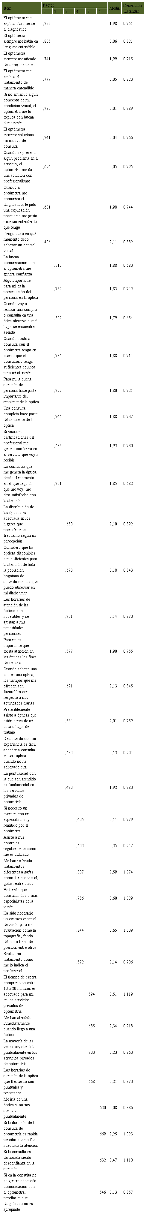 En esta investigación se evidenciaron diferentes factores de calidad debido a la perspectiva de los usuarios de acuerdo a sus experiencias con el servicio en las entidades privadas de salud visual y el concepto que tienen de la definición de los factores los cuales para este estudio no fueron exactos e incluso diferentes a los 9 evidenciados en la literatura. Estos hallazgos permitieron encontrar que algunos factores subsumían a los otros (accesibilidad y disponibilidad) llamado accesibilidad dado que para los entrevistados era más familiar, (Puntualidad, Tiempo de Espera y Tiempo de Servicio) denominado noción del tiempo, pero a su vez los factores 6 factores finalmente encontrados contenían preguntas de cada factor es decir que los 9 fueron evaluados cada uno con 12 preguntas obtenidas de las entrevistas. Posterior a esto se realizó en Excel un formato que contenía definición de los factores ya mencionados en la revisión de literatura el nombre dado al factor a evaluar y las 108 preguntas se envió a 12 jueces expertos para evaluación del instrumento donde se les solicito su evaluación con K=0,896 lo cual indica acuerdo. Consecuentemente, se revisaron los supuestos previos de normalidad, heterocedasticidad y multicolinealidad, los resultados muestran ausencia de normalidad, no heterecedasticidad y cierto grado de multicolinealidad. Posteriormente, se realizó la prueba de KMO y de esfericidad de Bartlett que se presenta en la Tabla 3; adicionalmente, se revisó la adecuación individual a partir de la matriz de correlaciones anti-imagen. Lo anterior, permitió verificar la viabilidad de ejecutar análisis factorial exploratorio.