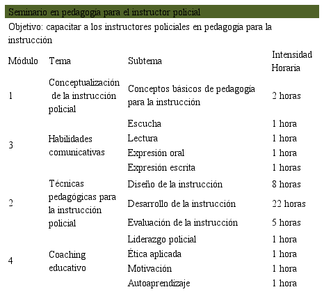Este Seminario de Pedagogía para el Instructor Policial, se debe fundamentar en ejercicios prácticos donde se emplee la condición física, los conocimientos de ética aplicada, el liderazgo policial, los Derechos Humanos y los procedimientos de policía entre otros. En cuanto a los contenidos temáticos y los horarios se deben realizar de la siguiente manera: