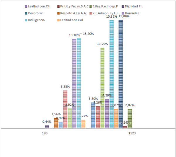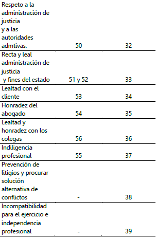Las demás conductas que les siguen, en orden descendente, son las faltas a la lealtad con el cliente (53-34), las faltas contra la dignidad de la profesión (48-30), las faltas contra el respeto a la administración de justicia y a las autoridades administrativas (50-32), las faltas a la lealtad y honradez con los colegas (56-36) y finalmente, las faltas contra el decoro profesional (31-49).[3]