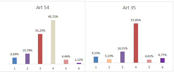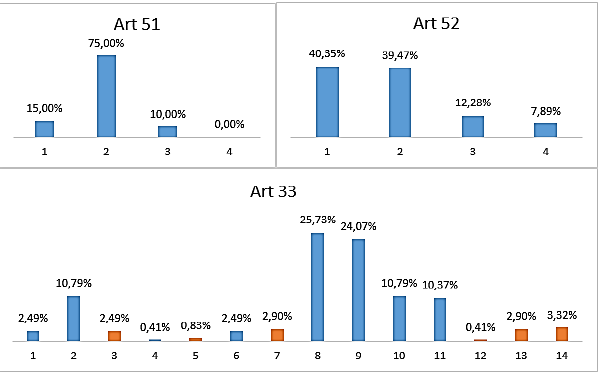 Acerca de los artículos nuevos, 38 y 39 de la Ley 1123, tiene mayor quebranto el artículo 39 que presenta 59 casos en la muestra, lo que enseña una tendencia importante a ejercer ilegalmente la profesión, inobservancia a las incompatibilidades y falta de independencia profesional; mientras el artículo 38, sólo presenta 6 casos todos violatorios del numeral 1[4], y ausencia de casos de violación al numeral 2, lo que muestra la aceptación a una de las principales intenciones del legislador desde hace algunas décadas, de institucionalizar la solución alternativa de conflictos.