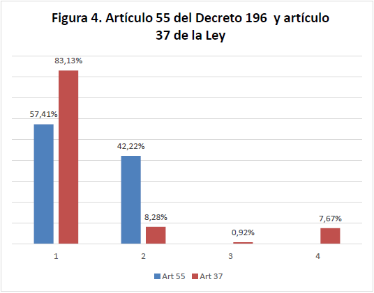 En el artículo 51, la conducta está ausente en esta muestra, y corresponde con la conducta representada en la barra sexta del artículo 33, relacionada con influir en los agentes de justicia; esta vez, con dádivas de contenido económico, para obtener la resolución favorable a sus intereses en el asunto. Bajo la vigencia de la Ley, aparece de nuevo reflejada la conducta como signo evidente de la corrupción que aqueja actualmente a la justicia; o, la ausencia en la muestra bajo la vigencia del Decreto, como signo de impunidad en relación con dichas conductas en la aplicación del Decreto 196; ambas circunstancias equivalen a ausencia de justicia. Si se observa en Figura 2 diagrama correspondiente a los pares 3-4 y 4-6, se evidencia cómo el dinero incide significativamente más que la intimidación, y se constituye en uno de los factores que hacen visible la creciente corrupción en los estamentos que conforman la administración de justicia.