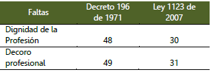 Para una mejor lectura de los datos, se ha elaborado en la Tabla 1., la correspondencia de las faltas en los dos estatutos. Así mismo, se realiza un recuento muy general de la normativa disciplinaria, que nos permite hacer memoria de las modificaciones efectuadas por la Ley 1123 de 2007 , en relación con el Decreto 196 de 1971: