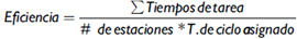 De la misma forma, al calcular las eficiencias para estos puntos, se observa que la mejor se obtiene en el rango de tiempo de ciclo explorado de (3,63 - 3,88) min, con una eficiencia de 87,38% para cuatro estaciones de trabajo. Sin embargo, para el caso de estudio se trabaja con un tiempo de ciclo de 1,88 min que genera una eficiencia de 84,36% (véase tabla 22), lo que arroja un número de estaciones m = 6, como la mejor solución para este tiempo de ciclo.