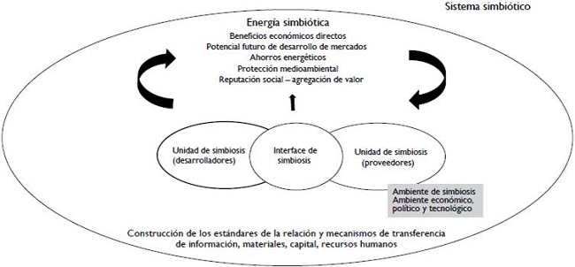 Fan (2019) propuso, por ejemplo, un modelo de sistema simbiótico para las organizaciones en un sector productivo. Se fundamentó en las relaciones de interacción que denominó "energía simbiótica", de esta manera logró precisar los beneficios económicos directos, el desarrollo de los mercados y las ventajas de la cocreación de valor. La figura 2 propone la modelización que el autor desarrolla en su modelo, en donde priman la construcción de estándares de las relaciones y los mecanismos de transferencia de distintos niveles de complejidad.