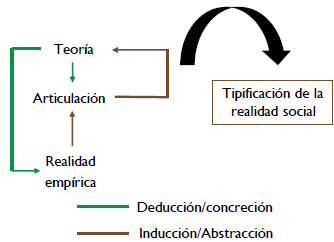 La metodología propuesta en este documento se fundamenta en una estrategia constructivista a partir del análisis de la realidad (López-Roldán & Fachelli, 2015; Sánchez-Gómez, Rodríguez & Costa, 2018). La cual puede observarse en la figura 3, en donde los autores proponen, desde la teoría y la realidad empírica, una articulación y tipificación de la realidad social, con la posibilidad, incluso, de ser intervenida. Se señala que desde la realidad empírica se realiza una inducción y abstracción. En el presente trabajo se analiza la teoría para encontrar la relación con los hallazgos en campo, los cuales se tomaron gracias a las entrevistas con la comunidad (más de diez habitantes integrados en la cadena de valor del turismo en la región), en octubre de 2019, en La Macarena.