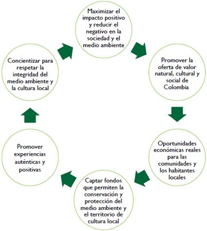 Una de las condiciones fundamentales es la protección del ecosistema, lo cual se dificulta cuando la carga de los turistas empieza a presionar el sistema natural; es allí en donde de nuevo se encuentra el sistema biológico y el económico. MinComercio (2013) propone unos elementos para posibilitar la aplicación de principios de sostenibilidad, que se observan en la figura 6.