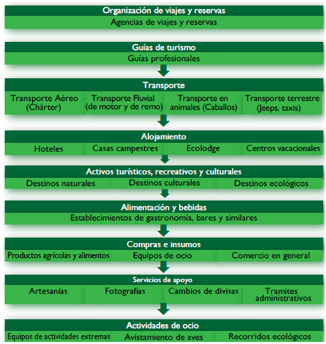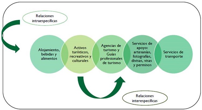 Se requiere una infraestructura sólida y estable de capital humano (el cual es capacitado no solo en el espacio físico, sino también en atención al cliente, cuidado del medioambiente, y conocimientos en ciencias básicas para la protección de los recursos), recursos físicos y planeación, de tal manera que el turismo de naturaleza permita un entorno competitivo, en el cual cada uno de los elementos de la cadena de valor interactúen para que se encuentre el modelo colaborativo-simbiótico. En general, los elementos de sostenimiento son la infraestructura, con servicios de ingeniería, bienes raíces y servicios financieros, el desarrollo de un capital humano, un desarrollo de mercado y el apoyo de organizaciones nacionales, regionales y de apoyo privado como agremiaciones y organizaciones sectoriales. La figura 7 señala los elementos de la cadena de valor que deben considerarse como "individuos" dentro del modelo ecosistémico y que contiene relaciones simbióticas, de tal forma que todos sean tenidos en cuenta y que encuentren interacción en cada uno de ellos.