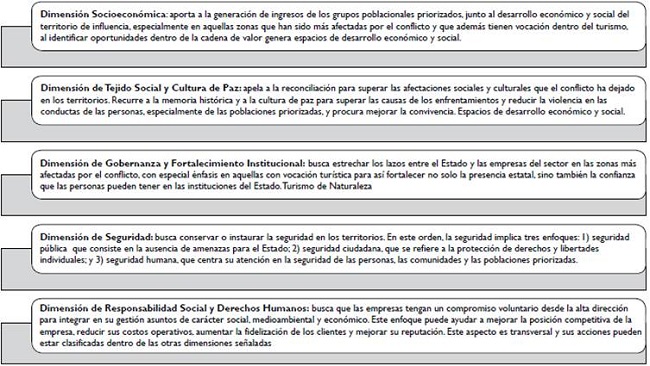 La estrategia del desarrollo del turismo en la región ha sido fundamental para posicionar los parques y ecosistemas, posibilitar medios económicos de subsistencia y encontrar un desarrollo sostenible con enfoque territorial, desarrollando elementos culturales y mejorando el entorno económico y social. Para ello, PARES (2018) destaca las dimensiones del proceso que pueden observarse en la tabla 2.