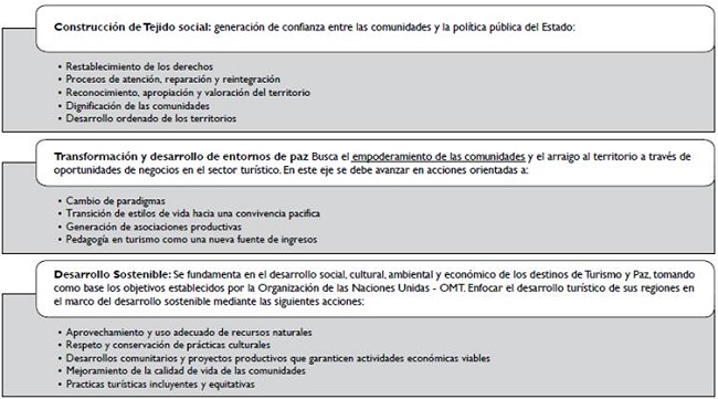 En el Plan Nacional de Desarrollo, 2014-2018, "Todos por un nuevo país", se propuso una sociedad en paz, educada y equitativa para desarrollar el sector turístico: "... en concordancia con la visión de país, (el cual) ha demostrado ser un importante factor de desarrollo que genera territorios de paz" (Ministerio de Comercio, Industria y Turismo, 2014) y dentro de este entorno, surge posteriormente, el programa "Turismo y paz", en donde se presentaron cuatro experiencias piloto seleccionadas: la serranía de la Macarena en el Meta, el Camino Teyuna en la Sierra Nevada de Santa Marta, el Valle de Sibundoy y Mocoa en Putumayo, y el Urabá Darién entre Antioquia y Chocó. (Bonilla, 2020; Ministerio de Industria y Turismo, 2018).