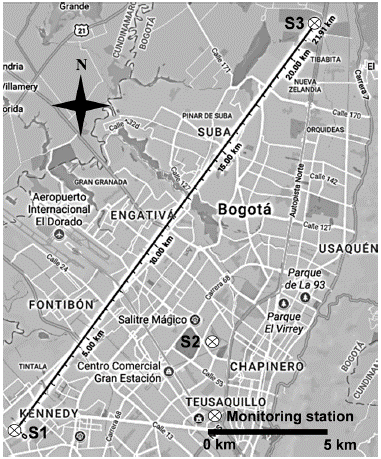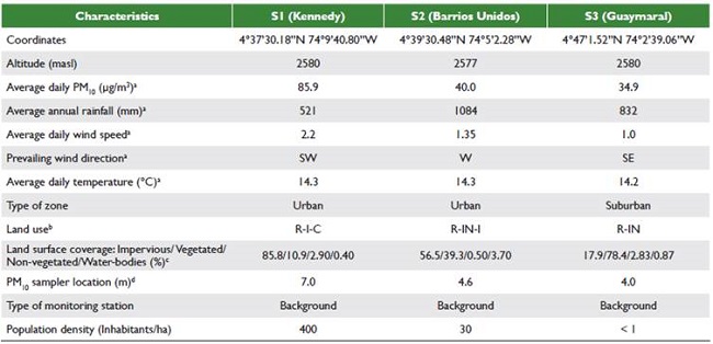 The three automatic monitoring stations were located in Kennedy (S1), Barrios Unidos (S2) and Guaymaral (S3) in Bogotá, Colombia. These stations were selected because they showed the maximum (S1) and minimum (S2 and S3) concentrations of PM10 during the study period. Additionally, the selected stations did not have any significant changes in land surface coverage, but they had information about climatic variables allowing for a determination of the AC. The tropical mountain climate showed an average daily temperature of between 13.3 -14.3°C and wide temperature variations per hour with variations between 7.2 - 19°C. Table 1 shows the main characteristics of each monitoring station. The locations of the monitoring stations are shown in Figure 1.