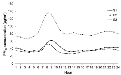 A Spearman's correlation analysis for all monitoring stations showed positive relationships with a tendency for medium values, Spearman's rs between 0.355 - 0.507. The results also showed uniform behaviour in the daily cycles of PM10 emission from motor vehicles and industries located across the entire study area. On average, S1 displayed the highest daily PM10 concentrations with daily concentrations of 115% and 146% higher than those displayed in S2 and S3, respectively.