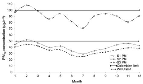 The reference legislation made it possible to demonstrate that the most critical monitoring station within the public health framework was S1. On average, this station exceeded the Colombian daily limit (24-h exposure time) during February by 7.8%, and the WHO daily limit for all months of the year by 80.4% (Fig. 3). Based on the WHO Air Quality Guide (WHO, 2005), the daily PM10 concentration observed in February at the S1 monitoring station (average = 107.8 µg/m3) could increase the short-term mortality rate by 2.9% with relation to the mortality rate observed for a concentration of 50 µg/m3 (WHO maximum permissible level). The WHO (2005) reported that the adverse effects on human health could not be ruled out below the established maximum permissible level, but that compliance with these standards supposes a significant reduction of the risks on public health. On average, for all months, in the area of influence around the S1 monitoring station, there was probably an increase of 2.0% in the daily mortality rate associated with PM10. S2 and S3 monitoring stations complied with the Colombian limit during all months, and the S3 station was the only one that complied with the WHO limit throughout the year.