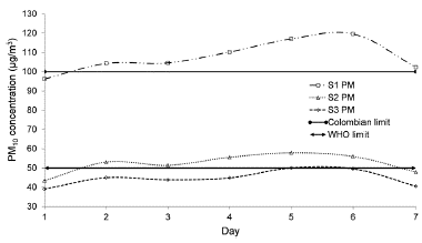 On a weekly basis, the highest daily PM10 concentrations tended to occur during the exposure period between Friday and Saturday (Figure 4). On average, concentrations during this exposure period were higher (S1 = 14.3%, S2 = 13.3%, and S3 = 16.8%) compared to the concentrations observed during the exposure period between Sunday and Friday. This trend was probably due to the fact that in Bogotá there was a restriction on vehicular movement due to traffic congestion from Monday to Friday. This traffic restriction prevented the use of 40% of the city's vehicles between 6 and 9 a.m., and 3 and 7 p.m. In other words, there was no traffic restriction on Saturdays; which probably explained the increase in PM10 concentrations on this day.