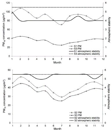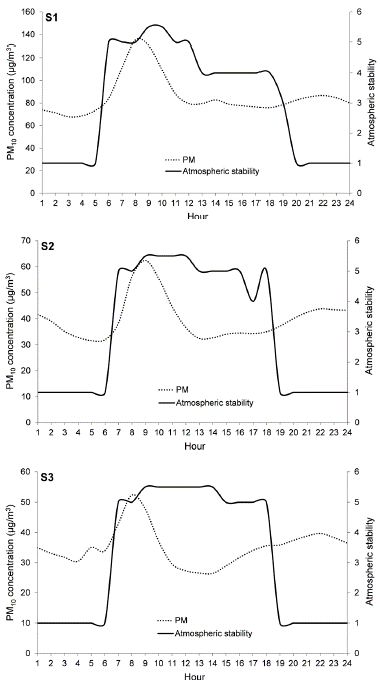 However, on an average monthly basis the results showed comparatively that the order of precedence for the degree of daytime atmospheric instability was as follows: S3 (AC = 5.5) > S2 (AC between 5 and 5.5) > S1 (AC between 4 and 5). The results also showed that the order of precedence for PM10 concentration was as follows: S1 (90.2 µg/m3) > S2 (4l.3 µg/m3) > S3 (35.6 µg/m3).Thus, the results indicated that the daily PM10 concentrations were the lowest at the monitoring station that associated the highest degree of daytime atmospheric instability (see S3 in Figure 6).