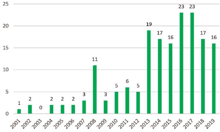 A continuación, la figura 1 muestra la distribución, por años, de los crímenes.