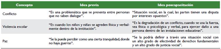 Antes de la capacitación se realizó un ejercicio de lluvia de ideas sobre los conceptos mencionados, en el que cada estudiante señalaba en una hoja de papel lo que pensaba sobre las palabras conflicto, violencia escolar y paz; al finalizar la fase teórica sobre estos se volvió a aplicar el ejercicio sobre los conceptos, en la misma hoja de papel, para hacer un contraste sobre la formulación conceptual de dichos términos, lo que después de un procesamiento de datos en Atlas.ti 8 en un panorama general, encontró lo siguiente (ver tabla 1).