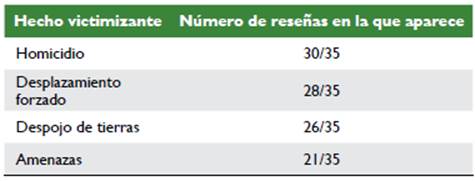 Las otras dos sesiones consistieron en el refuerzo de los conocimientos históricos del conflicto armado y su incidencia en las relaciones sociales, económicas y culturales en las zonas afectadas. Asimismo, se pidió a los estudiantes elaborar una reseña histórica de los territorios en los cuales estaban desempeñando su práctica profesional, con el propósito de adquirir una contextualización integral de las localidades donde trabajan. Se solicitó igualmente, que elaboraran una lista con los hechos victimizantes que sufrieron las poblaciones donde se desempeñaban como docentes practicantes; entre los más frecuentes se encuentran los que se presentan en la tabla 2.