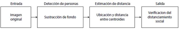 En la etapa de entrada, se ingresan al sistema las imágenes obtenidas mediante el dispositivo de captura de video ubicado a 4.5 metros de altura. De igual manera, en la etapa de detección de personas, se aplica la técnica de sustracción de fondo con segmentación por inspección de picos y umbralización adaptativa por el método de Otsu, en la que se separa el objeto en movimiento del fondo de la imagen. En la etapa de estimación de distancia, se aplica el método de los momentos para la ubicación de centroides en las detecciones y el método euclidiano para la obtención de distancia entre ellos. Con lo anterior, se determina el porcentaje de cumplimiento a la medida de distanciamiento social de dos metros entre personas en la etapa de salida del proceso.