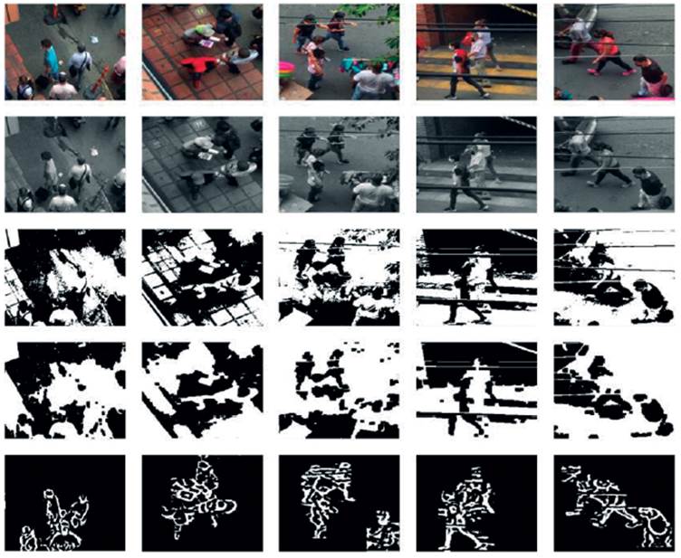 Siguiendo la metodología propuesta, se presenta el procesamiento a las imágenes de video capturadas en las zonas de espacio público de la ciudad de Cúcuta. En primer lugar, se muestran las imágenes capturadas originales, seguido de la conversión a escala de grises. Asimismo, se muestra la segmentación al fondo de la imagen por el método de inspección de picos. Se presentan, también, las imágenes filtradas por suavizado con posterior morfología, y la umbralización de estas por el método adaptativo de Otsu con distinción de contornos, como se observa en la figura 2.