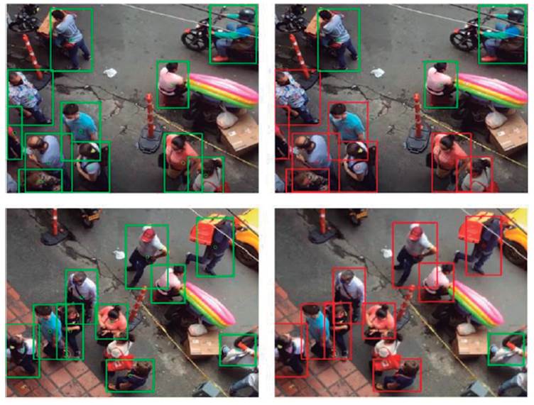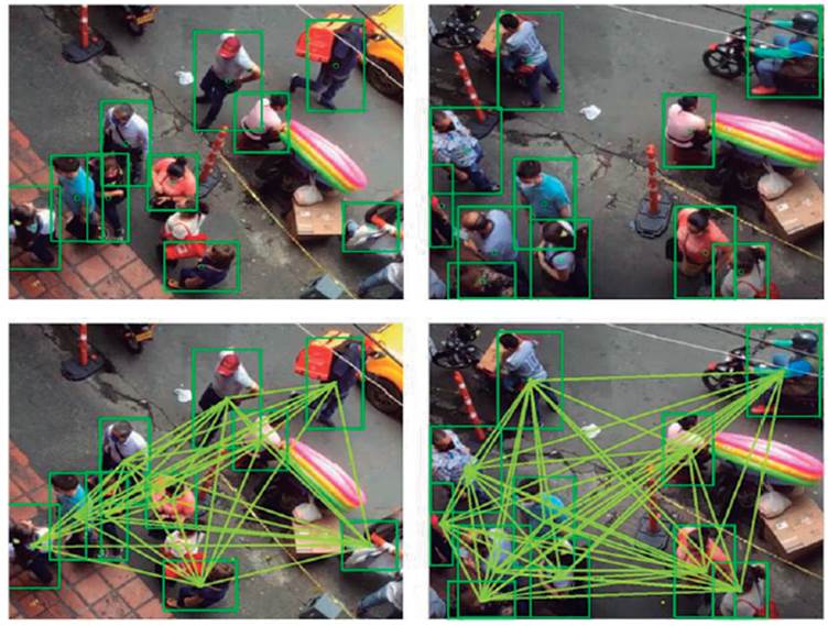 En adición, en la figura 4, se presenta una comparación entre las imágenes con los centroides detectados y mostrados en la fila superior de la misma figura y los cen troides obtenidos posterior a la estimación de distancia. En color verde se muestra a quienes cumplen la medida de distanciamiento social, mientras que en color rojo se presenta a quienes no.