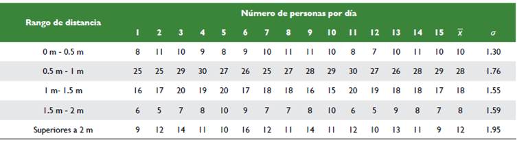 En la tabla 1, se presentan los rangos de distancias y el número de personas detectadas en los 15 días de implementación del sistema. El 13.16 % de las personas se separa a distancias menores a 0.5 metros; el 36.84 % se distancia entre 0.5 metros y 1 metro; el 23.68 % de la ciudadanía se aleja entre 1 metro y 1,5 metros; mientras que el 10.53 % se distancia entre 1.5 y 2 metros. De la misma manera, el 15.79 % de las personas toma distancias entre sí superiores a dos metros. Además, se presentan los valores medios del número de personas aproximados por exceso y la desviación estándar de estos, siendo 1.30 la variación del número de personas distanciadas a menos de 0.5 metros; 1.76 para quienes se alejan entre 0.5 y 1 metro; 1.55 si se distancian entre 1 y 1.5 metros; 1.59 para las personas que se separan entre 1.5 y 2 metros, y 1.95 para quienes cumplen la medida de distanciamiento social al alejarse mínimo dos metros.