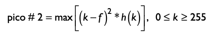 Se utiliza el método de inspección de picos, a través de la ponderación de valores que se encuentren entre los picos del histograma (Vargas, et al., 2013). El primer pico corresponde al valor más alto de la imagen en cuestión, mientras que el segundo pico se obtiene de la forma mostrada en la ecuación 2, donde K es el nivel de gris en cuestión, f el nivel de gris del pico más alto y h(k) corresponde al valor del histograma para dicho nivel.