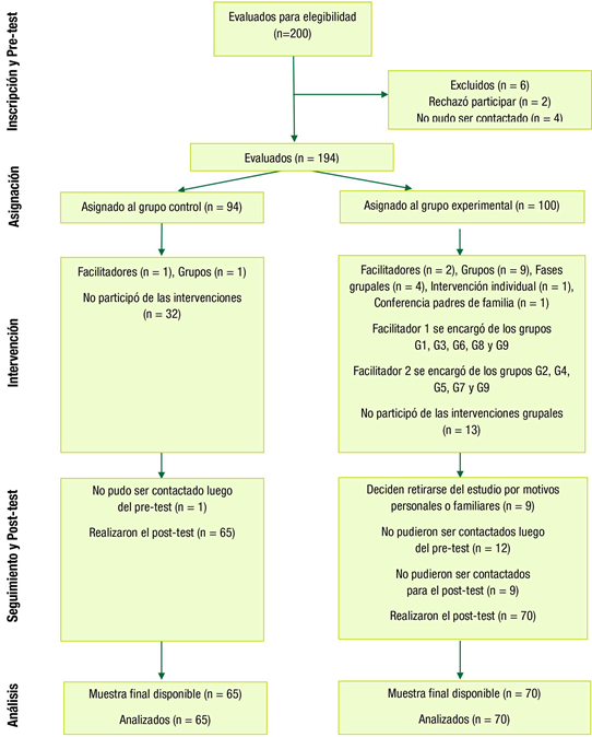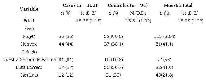De los 200 estudiantes invitados a participar, dos rechazaron la invitación y cuatro no pudieron ser contactados. La muestra de estudio estuvo conformada por 194 estudiantes, 58.4 °% mujeres y 41.1 °% hombres, con una edad media de 13.76 años (D.E. = 1.089). De los estudiantes, el 36 °% pertenecía al colegio Nuestra Señora de Fátima, 41.6 °% estudiaban en el colegio Elisa Borrero y 12 °% en el colegio San Luis. De estos estudiantes, 100 fueron asignados al grupo experimental y 94 al grupo control (Tabla 1).