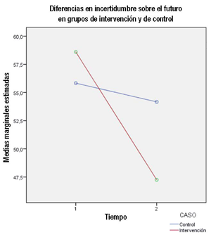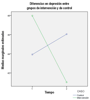 La comparación de medias previas y posteriores a la intervención evidenció una tendencia a la disminución en el grupo experimental en todas las subescalas que reflejan problemas; mientras que la subescala de autoestima evidencia una tendencia al aumento. El ANOVA mixto de medidas repetidas evidenció un efecto significativo en las subescalas de incertidumbre sobre el futuro y depresión (Tabla 6). Cabe anotar que, aunque la incertidumbre frente al futuro disminuyó en ambos grupos, F = 16.897, p < 0.05, se encontró una interacción significativa entre el tiempo y la pertenencia o no al grupo de intervención, F = 8.619, p < 0.05 (Figura 2). La depresión no mostró un efecto significativo del tiempo, pero sí de la interacción entre el tiempo y el pertenecer al grupo de intervención, F = 4.349, p < 0.05 (Figura 3).