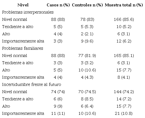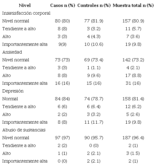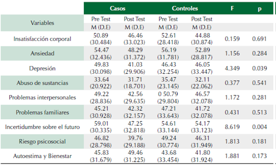 Respecto a las puntuaciones de evaluación posteriores a la intervención, el 17.1 °% de los adolescentes presentó un nivel de malestar muy significativo. En cuanto a las escalas clínicas, se destaca un 8.2 °% de insatisfacción corporal, equivalente a niveles importantemente altos; 11.9 °% de ansiedad, equivalente a niveles importantemente altos; 6.6 °% de depresión, equivalente a niveles importantemente altos y 14.1 °% de incertidumbre sobre el futuro, equivalente a niveles importantemente altos. Por otra parte, en la escala de riesgo psicosocial se evidencia un 85.8 °% de puntuaciones en niveles normal y un 5.2 % en niveles significativamente altos.