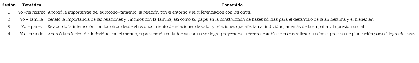La intervención consistió en un acompañamiento sincrónico grupal, una mentoría individual, una conferencia virtual a padres de familia y un cuadernillo para realización de actividades de forma asincrónica. Para los talleres grupales se establecieron pequeños grupos de diez estudiantes, facilitando un espacio que permitiera una interacción más cercana entre los asistentes. Se iniciaba con un saludo y con la revisión de los retos realizados durante la semana, luego se presentaba el tema de la sesión y se iniciaba el desarrollo de las actividades propuestas. Cada sesión incluía un ejercicio de mindfulness y para terminar se resolvían dudas y se explicaban los retos de la siguiente semana. Cada taller tenía una temática distinta basada en los sistemas del modelo ecológico (Tabla 2). El acompañamiento asincrónico se hizo a través de un cuadernillo de actividades que incluía retos semanales relacionados con las temáticas de cada sesión, de forma que los participantes pudiesen poner en práctica lo aprendido durante la misma y fuera de ella.