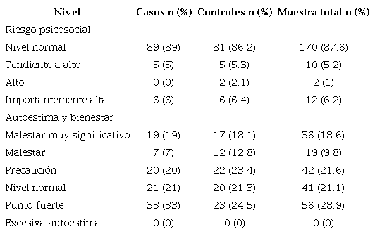 Los resultados de la evaluación señalaron que hay un 9.8 % de insatisfacción corporal, equivalente a niveles importantemente altos; 16 % de ansiedad, equivalente a niveles importantemente altos; 9.8 % de depresión, equivalente a niveles importantemente altos; y 10.8 °% de incertidumbre sobre el futuro, equivalente a niveles importantemente altos. Por otra parte, en la escala de riesgo psicosocial se evidencia un 87.6 °% de puntuaciones con nivel normal y un 6.2 °% con niveles significativamente altos. Finalmente, un 18.6 °% de los adolescentes evaluados presentaron un nivel de malestar muy significativo en l a escala de autoestima, lo que resalta la importancia de la intervención propuesta (Tabla 3, Tabla 4 y Tabla 5). Cabe anotar que no se encontraron diferencias significativas entre los grupos de intervención y control en ninguna escala.