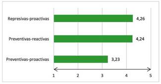 Adicionalmente, con el objetivo de lograr un ejercicio comparativo, también se indagó acerca de las actividades represivas-proactivas, que representan una categoría opuesta a la anterior, pues existe una predisposición al uso de la fuerza o bien se actúa sobre hechos delictivos consumados, todo ello mediado por una búsqueda consciente de la policía por realizar estas prácticas, persiguiendo objetivos de disuasión e incapacitación intensiva (Medina, 2013). Tales prácticas encajan con acciones que enarbolan ciertos programas policiales como: tolerancia cero, puntos calientes, Compstat (Famega, 2003).