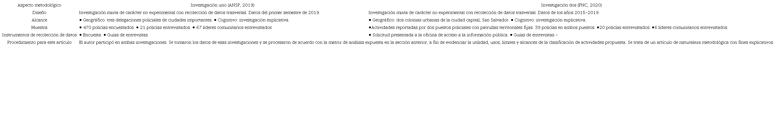 Por otra parte, el segundo estudio se trata de una investigación académica doctoral, que se basó en datos solicitados a la Policía Nacional Civil (PNC) por medio de la oficina de acceso a la información pública (PNC, 2020). Allí, se trabajó ajustándose al sistema de registro institucional de la policía, lo cual implicaba aceptar límites en cuanto a las actividades de las que se disponía, los datos y la manera en que la policía había conceptualizado las acciones.