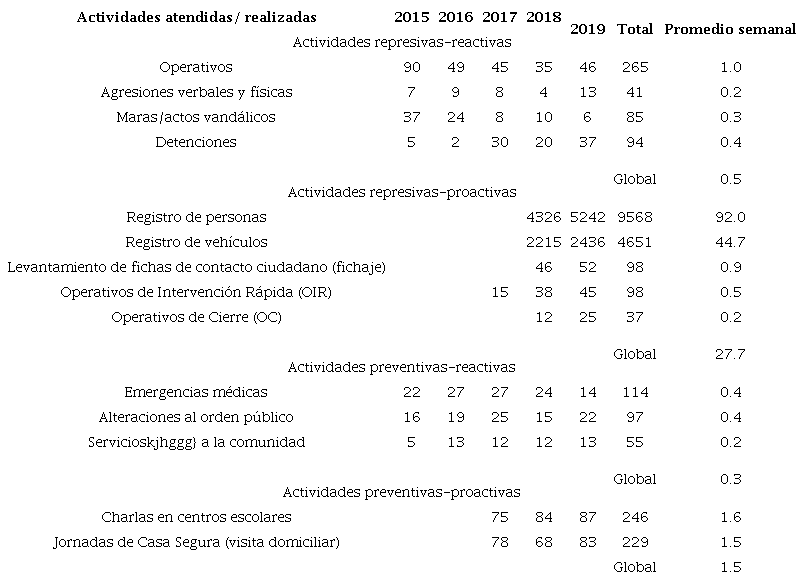 Solo se tomaron algunas de las actividades reportadas, mientras que estas fueran representativas de los conceptos esbozados páginas atrás, para evitar confusiones en las unidades policiales que las realizaban. Por ejemplo, se obtuvieron datos de los accidentes de tránsito atendidos y reportados por la ciudadanía mediante el sistema de emergencias telefónico, pero se sabe que estos son más atendidos por policías de la Unidad 911 que por las patrullas territoriales, razón por la cual fueron obviados para la investigación.