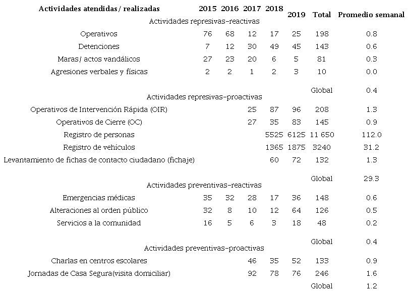 La predominancia de este último grupo de actividades indicaría que la policía habría logrado motivar a buena parte de su personal, así como disuadir y contener los delitos en un nivel adecuado para que la atención represiva no eclipse el desarrollo proactivo de acciones preventivas que requieren más tiempo y dedicación.
