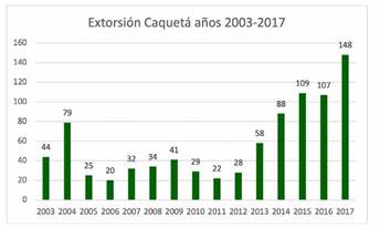 El departamento del Caquetá ha sufrido el flagelo de la extorsión desde que las Farc-Ep hicieron presencia en este departamento, a finales de los años sesenta, sustituyendo la presencia del Estado para cumplir como agente del orden de la colonización del departamento. En esta zona del país consiguieron una aparente legitimidad con el supuesto control del incremento de la criminalidad y del sometimiento de los campesinos por parte de comerciantes de la hoja de coca (Centro Nacional de Memoria Histórica, 2014).