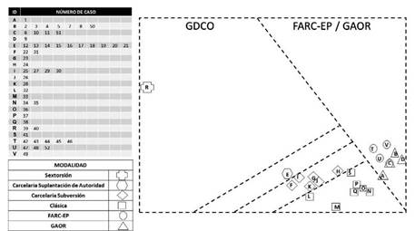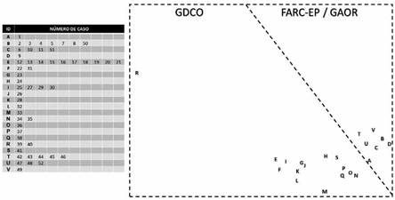 En la parte izquierda de la Figura 2 hay un recuadro que contiene los 52 casos dentro de 22 perfiles identificados (ID) con letras de la A a la V, mostrando para cada letra el número del caso que se corresponde con ese perfil. Como se observa, algunas letras agrupan varios perfiles, es decir, los casos son idénticos. Al costado derecho de la figura se observa la ubicación de los 22 perfiles que identificó el MSA dentro del espacio geométrico, a partir del grado de correlación entre ellos. Con esta información, los investigadores trazaron una línea punteada que demarcó dos regiones de agrupación, teniendo en cuenta la cercanía espacial entre los perfiles: una zona en la parte inferior izquierda de la figura agrupa los 30 casos que corresponden a los Gdco, según la investigación judicial, mientras que la segunda zona, al lado derecho de la figura, señala los perfiles de 22 casos, entre los que se incluyen los 11 atribuidos a las Farc-Ep, antes de su desmovilización, y los 11 restantes, que se pueden atribuir, a partir de estos hallazgos, a los Gaor, en la medida en que actúan de manera similar a las antiguas Farc-Ep. El perfil C recoge uno de los casos atribuidos a las Farc-Ep, y que coincide con tres de los perfiles de los Gaor, lo que indica que las Farc-Ep y los Gaor presentan una misma modalidad extorsiva. La Tabla 3 muestra los perfiles que caracterizan el accionar de las Farc-Ep y los Gaor.