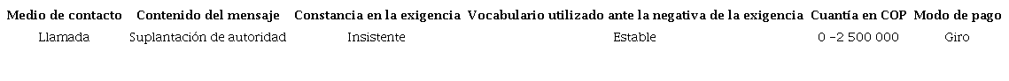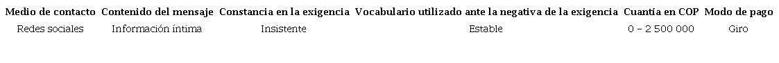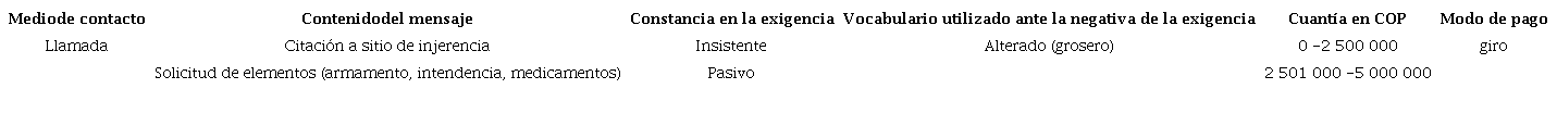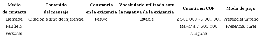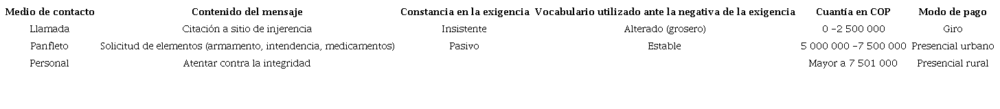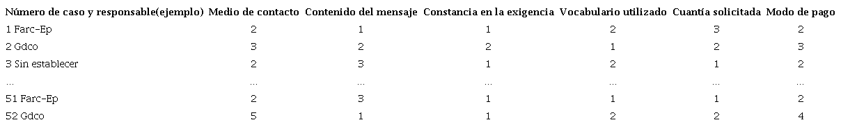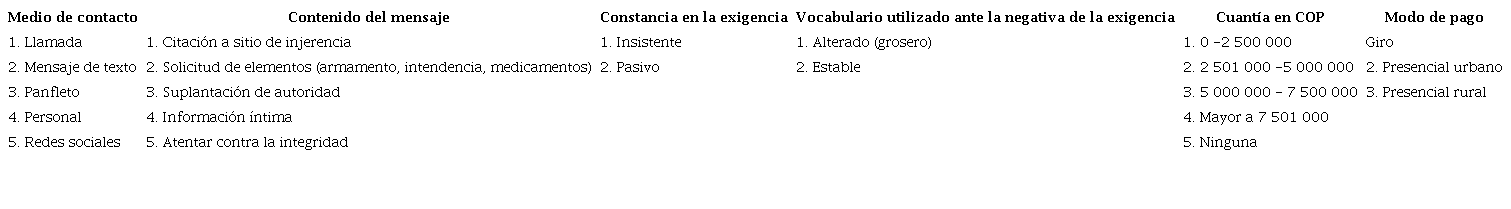 Con el propósito de establecer el modus operandi de los grupos relacionados con el delito de extorsión en el departamento del Caquetá, a partir de seis variables establecidas para asociar cada caso con el motivo de la extorsión, se extrajo información de las denuncias y entrevistas presentadas por las víctimas y por terceros cercanos. Para cada una de las variables se establecieron posibles formas de manifestación, a partir de las evidencias recogidas sobre los incidentes conocidos. Así, por ejemplo, se establece que: 1) el medio de contacto de la extorsión puede ser una llamada telefónica, un mensaje de texto, un panfleto, por contacto personal o por el empleo de alguna red social; 2) el contenido del mensaje evidencia que puede ser una citación en un sitio de injerencia, la solicitud de elementos de difícil adquisición (armamento, intendencia, medicamentos), la suplantación de autoridad, la trasmisión de información íntima de la víctima o la amenaza con atentar contra la integridad de la víctima; 3) la constancia en las exigencias puede ser insistente o pasiva, dependiendo de la frecuencia de las llamadas o de los mensajes enviados por parte del victimario; 4) en lo concerniente al vocabulario utilizado ante la negativa de la exigencia, el victimario actúa de forma alterada (grosero) o estable; 5) con relación a la cuantía exigida, para la época de los incidentes se registraron los siguientes rangos: de 0 a $2 500 000, de $2 500 000 a $5 000 000, de $5 000 000 a $7 500 000, más de $7 500 000 o ninguna exigencia en primera instancia; 6) por último, el modo de pago exigido por los criminales se suele presentar a través de giros o de manera presencial en área urbana o rural. Cada caso fue codificado, asignando números para cada una de las posibles situaciones dentro de cada variable, de acuerdo con la información conocida del incidente (Tabla 1).