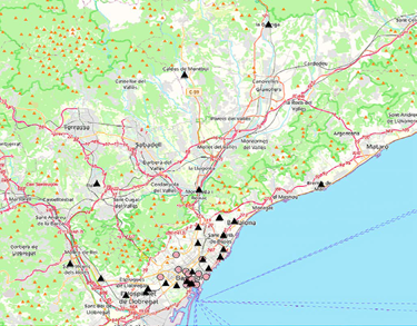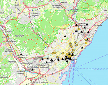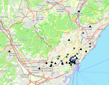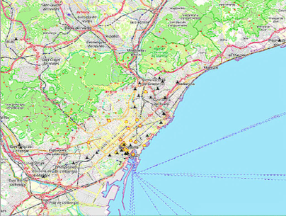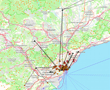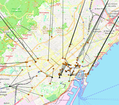 Los delincuentes se desplazan hacia el centro para hurtar. Algunos recorren distancias más largas que otros, y unos pocos provienen de las afueras de Barcelona: su domicilio no es visible en el mapa, pero puede intuirse por las líneas procedentes de un área exterior (figura 2).