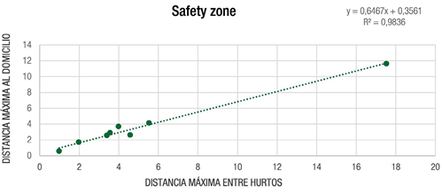La safety zone para los marauders es de 0.36 km y no tiene una direccionalidad privilegiada en la comisión de los hurtos, debido a que se ha obtenido un valor de la pendiente de 0.65 (próximo a 0.5). Esto significa que el domicilio se sitúa en el centro de los antecedentes. Este resultado es significativo, puesto que el coeficiente de correlación que se ha obtenido en la regresión lineal es de 0.98 (figura 11).