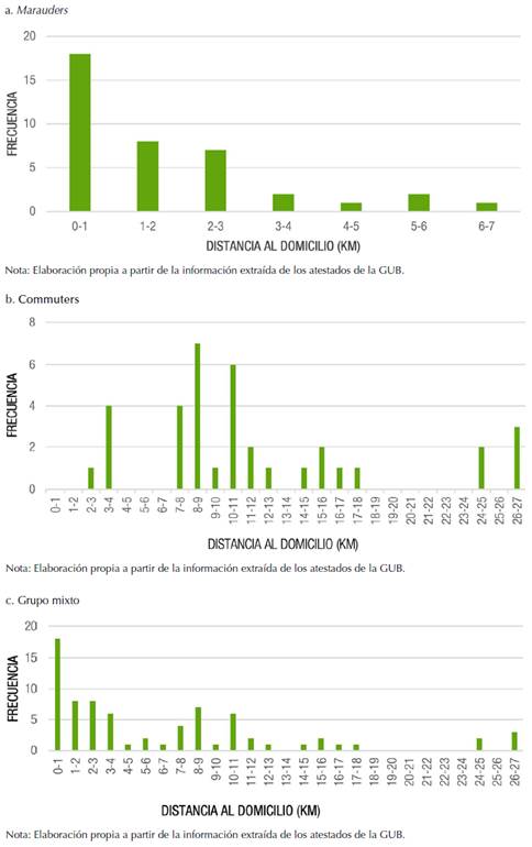 El grupo de los marauders presenta un patrón claro, pues la probabilidad de robo disminuye con respecto a la distancia entre el lugar del robo y el domicilio (figura 12A), contrario a lo que sucede con los commuters (figura 12B) y con el grupo mixto (12C), que no presentan un patrón claro. Para el grupo de los marauders observamos que la mayoría hurta en un radio inferior a 3 km (85 °%). La mayoría de los commuters hurta en un radio entre 7 y 13 km (58 °%), aunque debido a la dispersión de la muestra no puede considerarse rango de actuación. Para el grupo mixto se encuentra que los delincuentes de la muestra hurtan en una distancia inferior a 7 km (59 °%), aunque tampoco puede considerarse como rango de actuación, por el mismo motivo anterior.